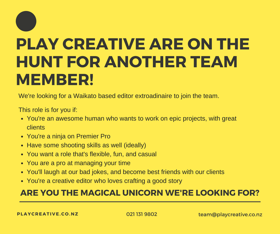 We're looking for a creative and talented video editor who's based in the Waikato, to join our team and help us keep up with the work we're booking! This would be a contract role which would start casually (on a project by project basis) with the opportunity to grow quickly and to develop into a more permanent contract.